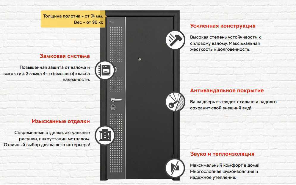 Полотно и коробка дверных конструкций производятся из высокомарочной холоднокатаной стали толщиной 1,5 мм. Поставщиком металла выступает «Новолипецкий металлургический комбинат». К техническим особенностям представленных моделей относят: