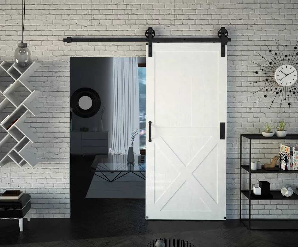 - Лофт. Уют для такой стилистики создают массивные амбарные раздвижные двери с тяжёлыми стальными подвесами и рейлингами.
